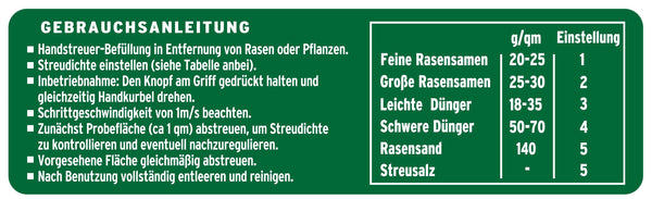 Den Sperrkopf durch Drücken entriegeln und gleichzeitig Handkurbel drehen. Während des Streuens mit gleichmäßigen Schritten gehen.